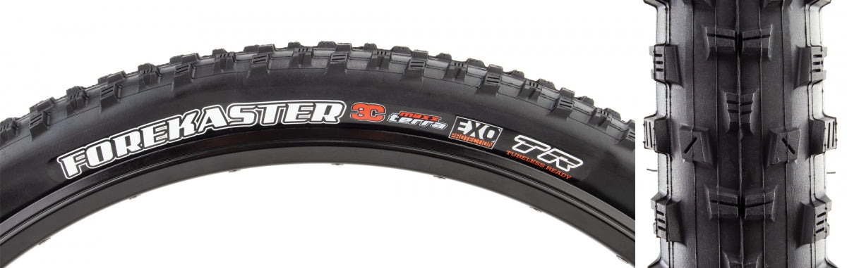 TIRE MAX FOREKASTER 29x2.4 BK FOLD/60 3T/EXO/TR/WT Forekaster 4717784041735 CLINCHER 29in Mid-height tread blocks are spaced evenly to allow penetration through loose trail conditions and openly for better mud-clearing Wide cupped knobs down the middle provide excellent braking in any conditions EXO equipped models feature Maxxis` EXO sidewall protection which help prevent puncture from sidewall abrasions TR - Tubeless Ready - sealant required WT - Wide Track casing optimized for rims over 35mm internal width TERRA - 3C Maxx Terra is softer and offers more traction than 3C Maxx Speed, yet provides better treadwear and less rolling resistance than Maxx Grip Tubeless 29x2.4 622 TBLS - Fold Bk/Blk 60 60 TERRA/EXO/TR/WT No Knobby