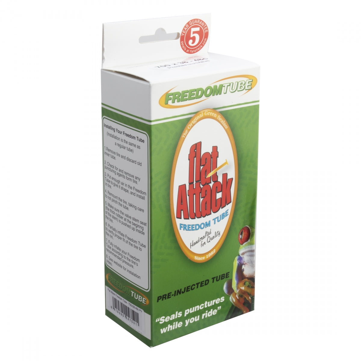 TUBE FLAT ATTACK 700x38-48 PV 44mm REMOVABLE-CORE Flat Attack Tube 8919390247501 SELF SEALING 700c PRESTA Flat Attack Freedom Tubes are pre-injected with Flat Attack All Freedom Tubes come with the Flat Attack 5-year guarantee Supports IBD Not sold in `Big Box` stores 700x38-48 PV 44mm 0d Threaded Removable 622 BLACK
