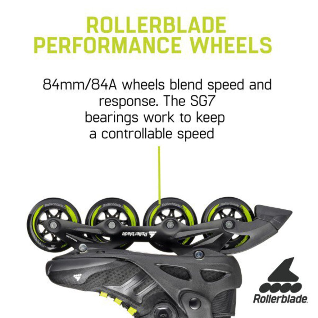 ROLLERBLADE PERFORMANCE WHEELS - 84mm/84A wheels blend speed and response perfectly. The SG7 bearings work to keep a lively skate pace with a controllable speed.