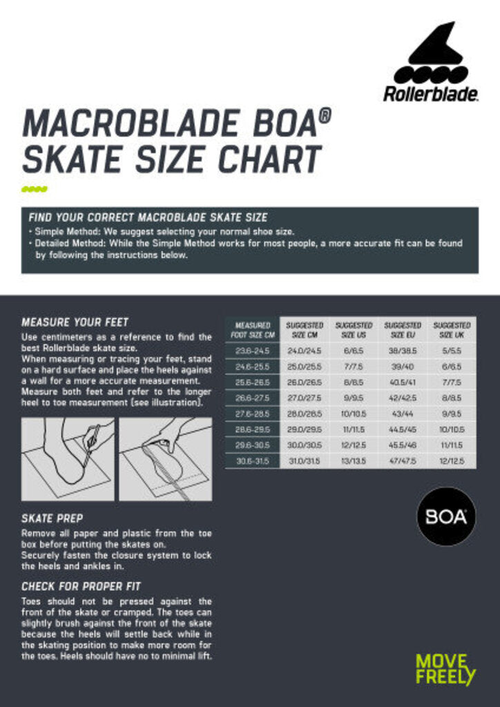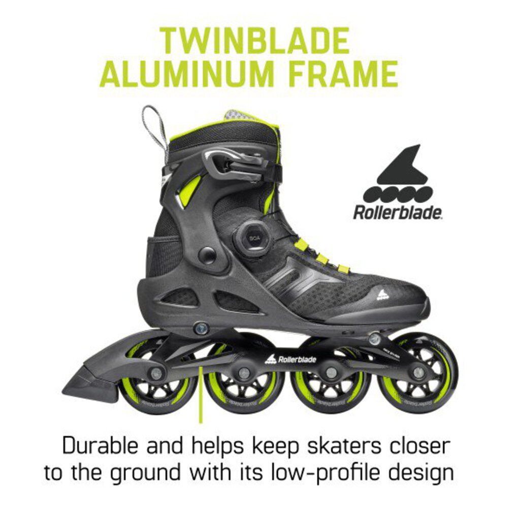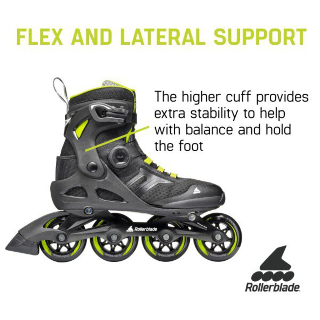 The Macroblade 84 BOA® combines Rollerblade® craftmanship, comfort and performance resulting in an enhanced entry-level skate with high-quality support, performance and convenience. The higher cuff allows extra stability for balance control, the liner is pure comfort with padding in the tongue and ankle areas to provide sock-like comfort and lateral support. The BOA® Fit System delivers a micro-adjustable precision fit that can be obtained fast and effortlessly with just turning the dial and the Footboard Sizer provides two sizes in one skate. It enables skaters to insert the Footboard under the insole to create a snugger, more performance fit or remove it to accommodate the bigger size for more room in their skates. The aluminum frame design keeps you closer to the ground and improves performance by adding more power transfer and durability. 84mm Performance wheels with SG7 bearings add a little speed when engaged. Macroblade 84 BOA® makes an ideal upgrade or first time skate with quality components and enhanced fit and support features