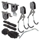 STORAGE RACK DELTA SINGLE BIKE CEILING HOIST (O) Single Bike Ceiling Hoist w/ Straps 799403302902 HOISTS Handy storage solution designed for ceilings up to 12ft and bikes or gear up to 100lbs Included accessory straps allow hoisting of larger items such as ladders or kayaks An auto-lock mechanism prevents accidental release, while rubber-coated hooks or straps support the object without damaging it Designed with inline bolt holes, it easily mounts to ceiling joists taking the guess work out of installation Convenient pulley system makes it easy to raise and lower your gear Includes mounting hardware and full instructions Hoist w/Straps 100lbs Black RS2300 BLACK